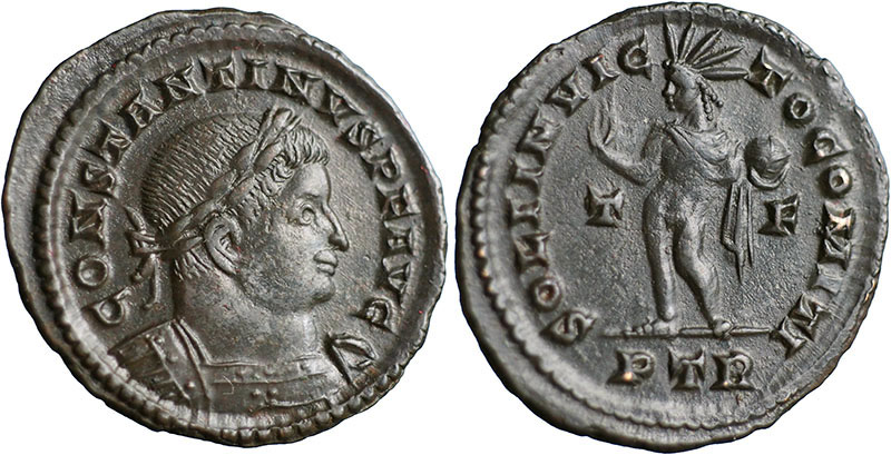 Ae Follis. SOLI INVICTO COMITI. Sol standing left, chlamys falling from left shoulder, globe in left hand. T / F in field mm PTR (Trier). RIC 873. |