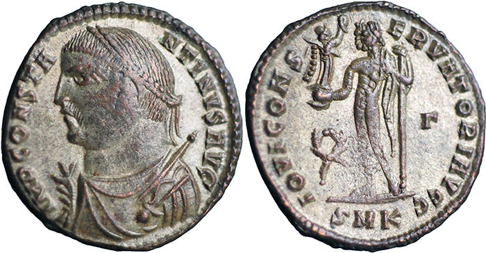 CONSTANTINE I. 307-337 AD. Ae Follis (19mm). Laureate bust left holding globe, sceptre and mappa. ® IOVI CONSERVATORI AVGG. Jupiter standing left, leaning on sceptre and holding Victory on globe. Wreath / 3rd officina mark in field. mm SMK (Cyzicus). RIC 8. Attractive with full silvering. |