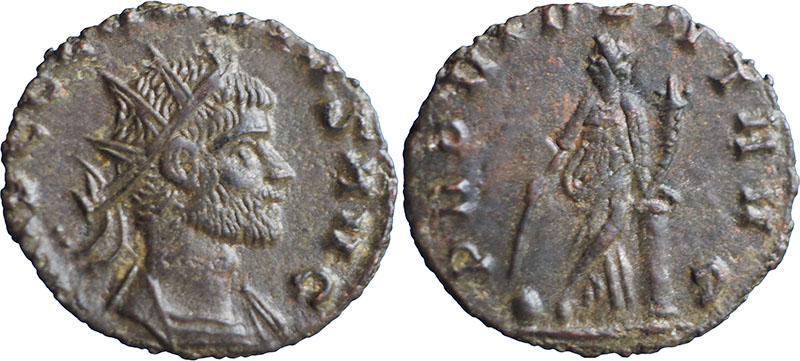 CLAUDIUS GOTHICUS. 268-270 AD. Æ Antoninianus. Mint of Rome. PROVIDENT AVG. Providentia standing left, with legs crossed, leaning on column, holding baton and cornucopiae, globe at feet. RIC V 91. |