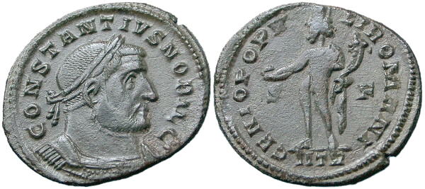 CONSTANTIUS I. As Caesar 293-305 AD. Æ Follis. GENIO POPVLI ROMANI. Genius standing left, head towered, holding patera and cornucopiae. S/F in field mm IITR (Trier). RIC VI 530a. |