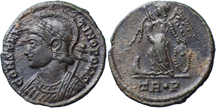 COMMEMORATIVE. 330-346 AD. Æ 3 (18mm). CONSTAN-TINOPOLIS, laureate, helmeted bust of Constantinople left, wearing imperial mantle, sceptre over left shoulder. ® No legend. Victory standing left on prow of ship, holding spear and shield. Mintmark TR dot P (Trier). RIC VII, 548. |