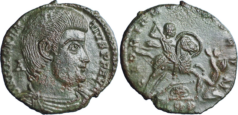 Æ 2 (21mm). DN MAGNENTIVS PF AVG. Bare headed, draped, cuirassed bust right, A behind. ® GLORIA ROMANORVM. Emperor on horseback galloping right, holding shield, spearing kneeling barbarian, shield and broken spear below horse. Mintmark: TRP (Trier). Attractive green patina. Same dies as WRB 8049. |