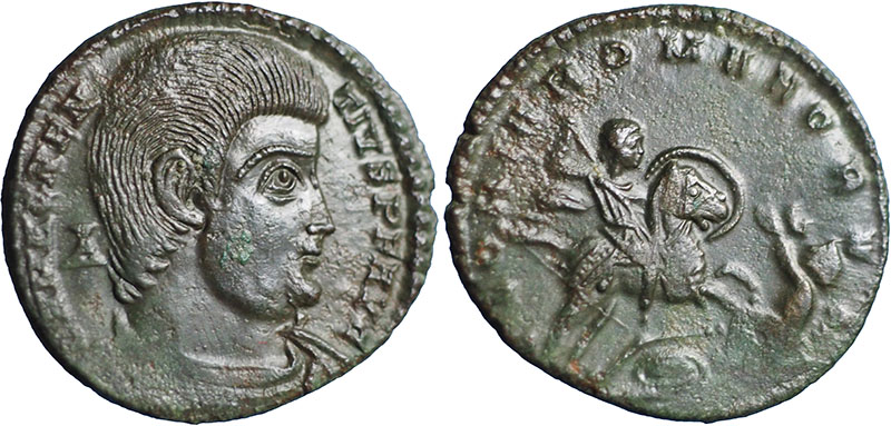 Æ 2 (21mm). DN MAGNENTIVS PF AVG. Bare headed, draped, cuirassed bust right, A behind. ® GLORIA ROMANORVM. Emperor on horseback galloping right, holding shield, spearing kneeling barbarian, shield and broken spear below horse. Mintmark: TRP (Trier). Attractive green patina. Same dies as WRB 8048. |