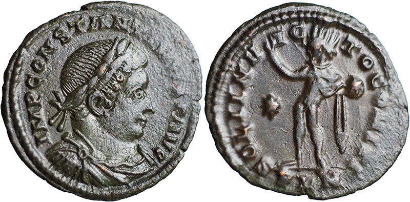 CONSTANTINE I. 307-337 AD. Æ Follis (20mm). SOLI INVICTO COMITI. Sol standing, chlamys on shoulder, holding globe. * in left field mm PLN (London). RIC VI, 282. |
