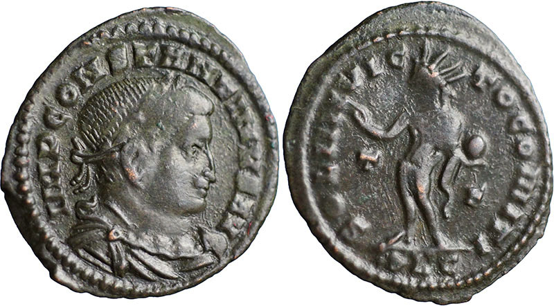 CONSTANTINE I. 307-337 AD. Æ Follis (20mm). SOLI INVICTO COMITI. Sol standing, chlamys on shoulder, holding globe. T / F in field mm PLG (Lyons). RIC VII, 19. |