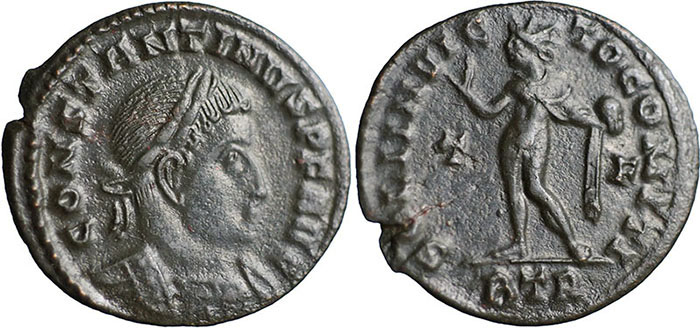 CONSTANTINE I. 307-337 AD. Æ Follis (20mm). SOLI INVICTO COMITI. Sol standing, chlamys on shoulder, holding globe. T / F in field mm BTR (Trier).RIC VII, 135. |