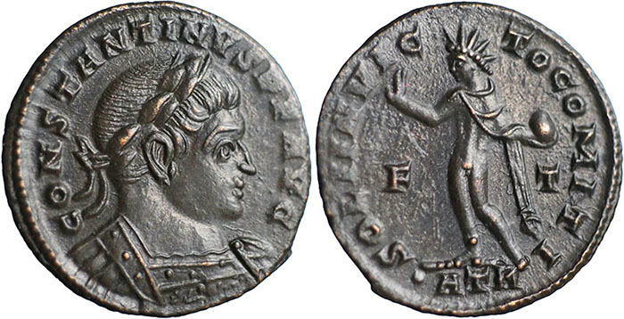 CONSTANTINE I. 307-337 AD. Æ Follis (20mm). SOLI INVICTO COMITI. Sol standing, chlamys on shoulder, holding globe. F / T in field mm .ATR (Trier). RIC VII, 162. |
