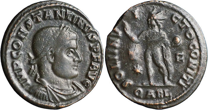 CONSTANTINE I. 307-337 AD. Æ Follis (20mm). SOLI INVICTO COMITI. Sol standing, chlamys on shoulder, holding globe. T with * below / F in field mm QARL (Arles). RIC VII, 75. |