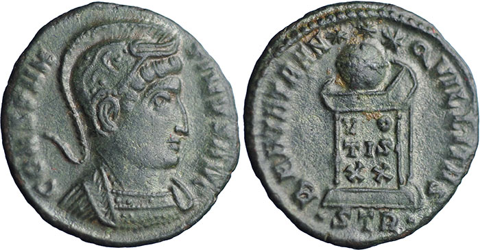 CONSTANTINE I. 307-337 AD. Æ 3 (18.5mm). Helmeted bust right. ® BEATA TRANQVILLITAS altar inscribed VO/TIS/XX. mm .STR. (Trier). RIC VII, 368. Olive green patina. |