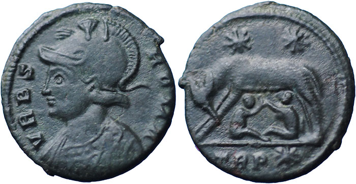 COMMEMORATIVE. 330-346 AD. Æ 3 (17.5 mm). VRBS ROMA, helmeted bust of Roma left, wearing imperial mantle. ® No legend. She wolf standing left, suckling Romulus and Remus, two stars above. Mintmark TRP* (Trier). RIC VII, 547. Olive green patina. |