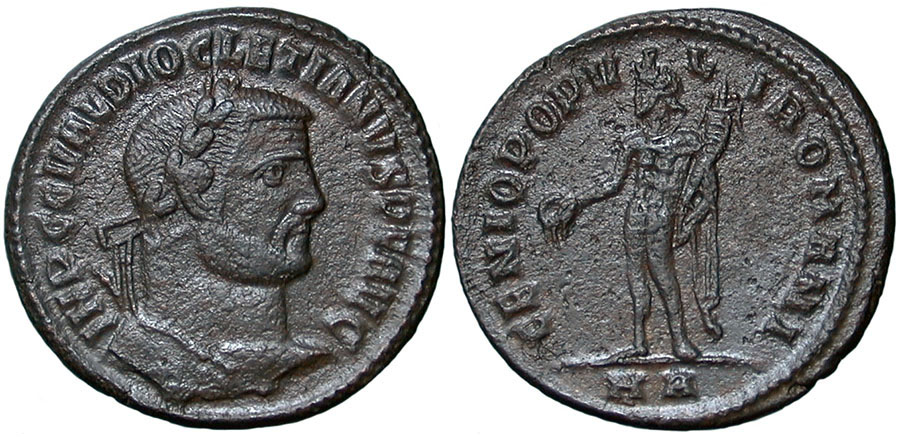 DIOCLETIAN. 284-305 AD. Æ Follis (26mm). IMP C C VAL DIOCLETIANVS PF AVG, laureate head right. ® GENIO POPVLI ROMANI, Genius standing left, holding patera and cornucopiae. mm HA (Heraclea). RIC VI, 12a. |
