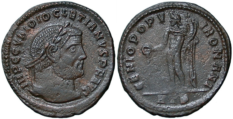 DIOCLETIAN. 284-305 AD. Æ Follis (27mm). IMP C C VAL DIOCLETIANVS PF AVG, laureate head right. ® GENIO POPVLI ROMANI, Genius standing left, holding patera and cornucopiae. mm HTB (Heraclea). RIC VI, 17a. |