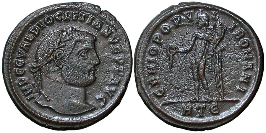 DIOCLETIAN. 284-305 AD. Æ Follis (27mm). IMP C C VAL DIOCLETIANVS PF AVG, laureate head right. ® GENIO POPVLI ROMANI, Genius standing left, holding patera and cornucopiae. mm HTE (Heraclea). RIC VI, 17a. |