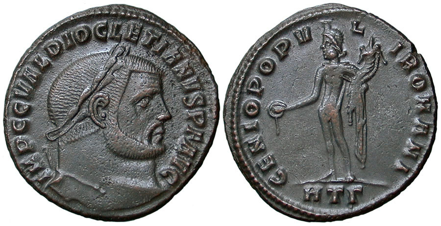 DIOCLETIAN. 284-305 AD. Æ Follis (28mm). IMP C C VAL DIOCLETIANVS PF AVG, laureate head right. ® GENIO POPVLI ROMANI, Genius standing left, holding patera and cornucopiae. mm HT(Gamma) (Heraclea). RIC VI, 19a. |