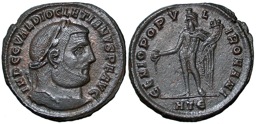 DIOCLETIAN. 284-305 AD. Æ Follis (28mm). IMP C C VAL DIOCLETIANVS PF AVG, laureate head right. ® GENIO POPVLI ROMANI, Genius standing left, holding patera and cornucopiae. mm HTE (Heraclea). RIC VI, 19a. |