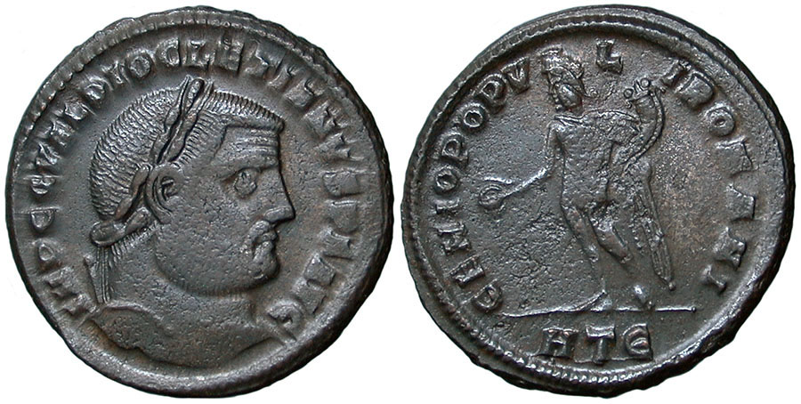 DIOCLETIAN. 284-305 AD. Æ Follis (28mm). IMP C C VAL DIOCLETIANVS PF AVG, laureate head right. ® GENIO POPVLI ROMANI, Genius standing left, holding patera and cornucopiae. mm HTE (Heraclea). RIC VI, 19a. |