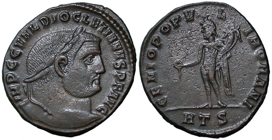 DIOCLETIAN. 284-305 AD. Æ Follis (27mm). IMP C C VAL DIOCLETIANVS PF AVG, laureate head right. ® GENIO POPVLI ROMANI, Genius standing left, holding patera and cornucopiae. mm HTS (Heraclea). RIC VI, 19a. |