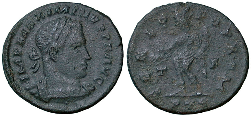 MAXIMINUS II. 310-313 AD. Æ Follis (24mm). IMP MAXIMINVS PF AVG, laureate, cuirassed bust right. ® GENIO-POP ROM, Genius standing left, turret on head, loins draped, holding patera and cornucopiae. T F in field. Mintmark PTR (Trier). RIC VI, 845a. |