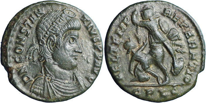 CONSTANTIUS II. 337-361 AD. Æ 3 (18 mm). DN CONSTANTIVS PF AVG, diademed, draped, cuirassed bust right. ® FEL TEMP REPARATIO, soldier spearing fallen horseman. mm GPLG (Lyons). Attractive glossy green patina. |