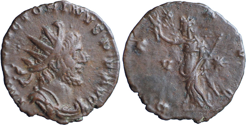 VICTORINUS. 268-270 AD. Æ Antoninianus. Trier mint. 3rd emission, 3rd phase, early-mid AD 270. IMP C VICTORINVS PF AVG. Radiate, draped, and cuirassed bust right. ® PAX AVG. Pax standing left, holding olive branch and transverse scepter; V to left, star to right. RIC V 118. |