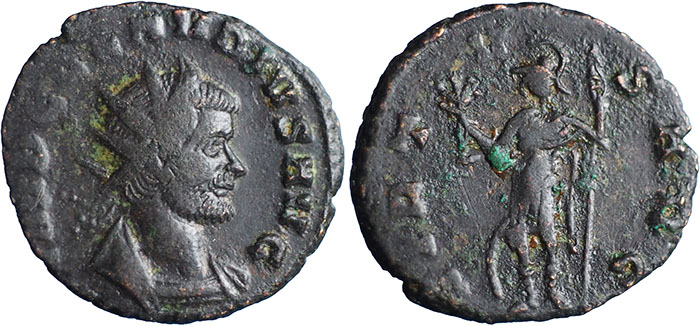 CLAUDIUS GOTHICUS. 268-270 AD. Æ Antoninianus. Mint of Rome. VIRTVS AVG. Mars standing left, holding branch and spear, shield at feet. RIC V 109. |