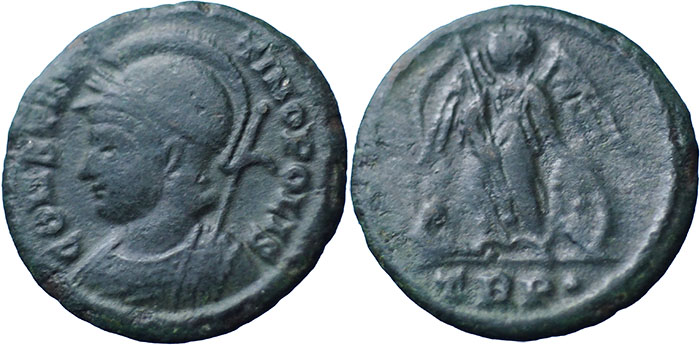 COMMEMORATIVE. 330-346 AD. Æ 3 (17 mm). CONSTAN-TINOPOLIS, laureate, helmeted bust of Constantinople left, wearing imperial mantle, sceptre over left shoulder. ® No legend. Victory standing left on prow of ship, holding spear and shield. Mintmark TRP dot (Trier). RIC VII, 530. |
