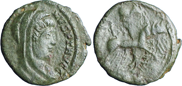 CONSTANTINE I. Commemorative. Æ 4 (15.5mm). 337-340 AD. Veiled head right. ® No legend. Constantine in quadriga galloping right, hand of god above. |