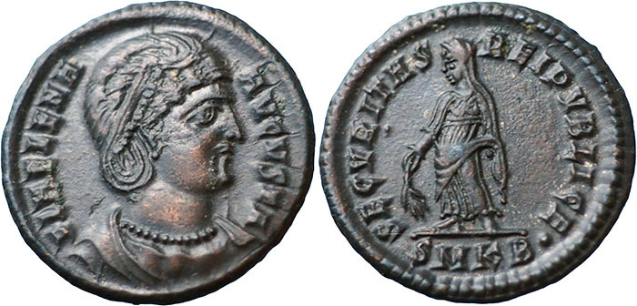 HELENA. Mother of Constantine I. Æ Follis (18mm). FL HELENA AUGUSTA, Diademed draped bust right. ® SECVRITAS REIPVBLICE, Securitas standing left holding branch and hem of robe. Mintmark SMKB dot (Cyzicus). RIC VII, 39 (B) Rated r1. |