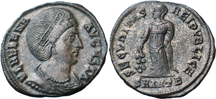 HELENA. Mother of Constantine I. Æ Follis (20mm). FL HELENA AUGUSTA, Diademed draped bust right. ® SECVRITAS REIPVBLICE, Securitas standing left holding branch and hem of robe. Mintmark SMANTB (Antioch). RIC VII, 80 (B) Rated r5. |