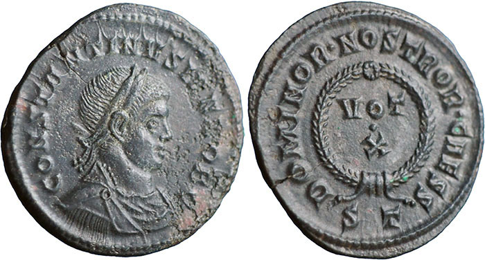 CONSTANTINE II. 317-337 AD. Æ 3 (20mm). CONSTANTINVS IVN NOB C, draped, cuirassed and laureate bust right. ® DOMINOR NOSTROR CAESS around VOT dot V in wreath. Mintmark ST (Ticinum). RIC VII, 154 Rated r3. |