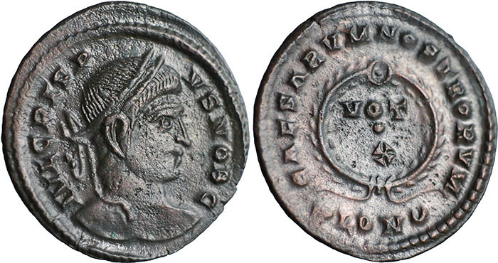 CRISPUS. 317-326 AD. Æ 3 (20mm). IVL CRISPVS NOB C, laureate head right. ® CAESARVM NOSTRORVM around VOT X within wreath. Mintmark PLON crescent (London). RIC VII, 291. |