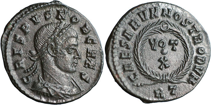 CRISPUS. 317-326 AD. Æ 3 (19mm). CRISPVS NOB CAES, laureate, draped, cuirassed bust right. ® CAESARVM NOSTRORVM around VOT X within wreath. Mintmark RT (Rome). RIC VII, 238. |