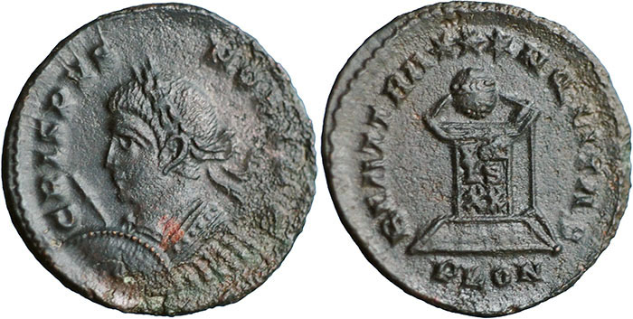 CRISPUS. 317-326 AD. Æ 3 (19mm). CRISPVS NOBIL C, Laureate bust left holding shield and forward pointing spear. ® BEAT TRANQLITAS altar inscribed VOT/IS/XX. Mintmark PLON (London). RIC VII, 279. |