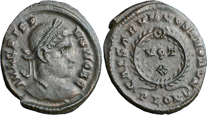 CRISPUS. 317-326 AD. Æ 3 (19mm). IVL CRISPVS NOB C, laureate head right. ® CAESARVM NOSTRORVM around VOT X within wreath. Mintmark PLON crescent (London). RIC VII, 291. |