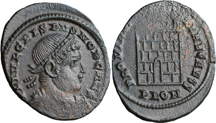 CRISPUS. 317-326 AD. Æ 3 (19mm). FL IVL CRISPVS NOB CAES, laureate, draped, cuirassed bust right. ® PROVIDENTIAE CAESS, campgate, two turrets, six layers, star above, no door. Mintmark PLON (London). RIC VII, 295. |