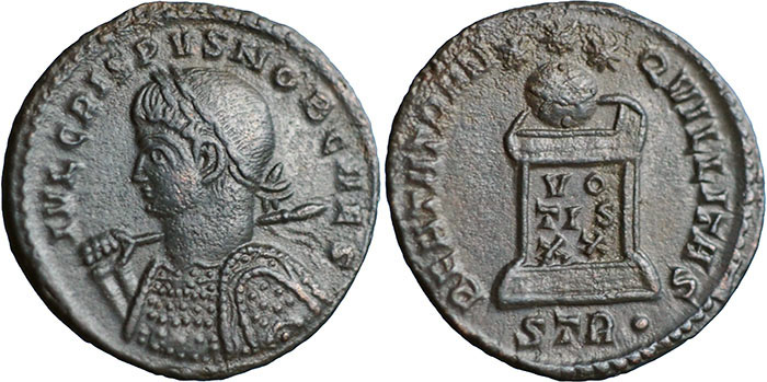 CRISPUS. 317-326 AD. Æ 3 (19mm). IVL CRISPVS NOB CAES, laureate and curiassed bust left holding spear over right shoulder, shield on left arm. ® BEATA TRAN-QVILLITAS, globe on altar inscribed VO/TIS/XX in three lines, three stars above. Mintmark STR dot (Trier). RIC VII, 347. |