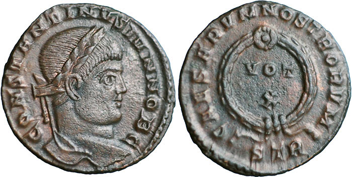CONSTANTINE II. 317-337 AD. Æ 3 (19mm). CONSTANTINVS IVN NOB C, laureate head right. ® CAESARVM NOSTRORVM around VOT X within wreath. Mintmark STR (Trier). RIC VII, 433. |