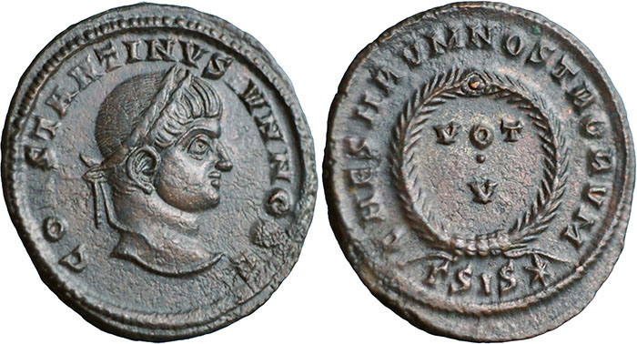 CONSTANTINE II. 317-337 AD. Æ 3 (19mm). CONSTANTINVS IVN NOB C, laureate head right. ® CAESARVM NOSTRORVM around VOT V within wreath. Mintmark Gamma SIS star (Siscia). RIC VII, 163. |
