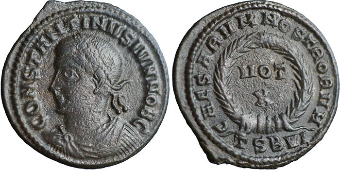 CONSTANTINE II. 317-337 AD. Æ 3 (19mm). CONSTANTINVS IVN NOB C, laureate, draped and cuirassed bust left. ® CAESARVM NOSTRORVM around VOT X within wreath, star in badge above. Mintmark TSBVI (Thessalonica). RIC VII, 122. |