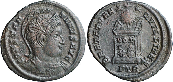 CONSTANTINE I. 307-337 AD. Æ 3 (19mm). CONSTAN-TINVS AVG, helmeted, cuirassed bust right. ® BEATA TRAN-QVILLITAS altar inscribed VOT/IS/XX. Mintmark PTR (Trier). RIC VII, 303. |