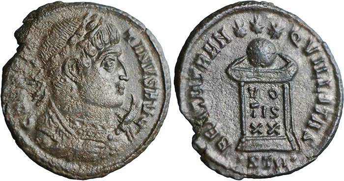CONSTANTINE I. 307-337 AD. Æ 3 (19mm). CONSTAN-TINVS AVG laureate bust right, wearing trabea, holding eagle tipped sceptre in right hand. ® BEATA TRAN-QVILLITAS altar inscribed VO/TIS/XX. Mintmark dot STR dot (Trier). RIC VII, 369. |