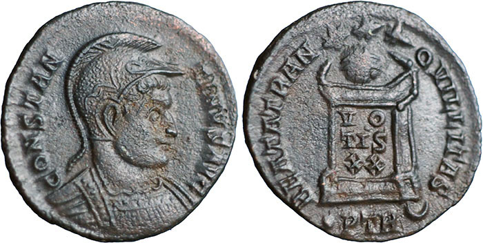 CONSTANTINE I. 307-337 AD. Æ 3 (19mm). CONSTAN-TINVS AVG, helmeted, cuirassed bust right. ® BEATA TRAN-QVILLITAS altar inscribed VO/TIS/XX. Mintmark dot PTR crescent (Trier). RIC VII, 389. |