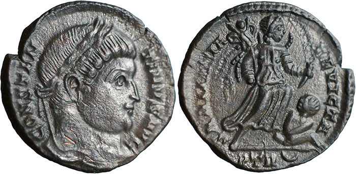 CONSTANTINE I. 307-337 AD. Æ 3 (19mm). CONSTAN-TINVS AVG, laureate head right. ® SARMATIA-DEVICTA, Victory advancing right holding trophy and palm, captive at feet. Mintmark PTR crescent (Trier). RIC VII, 435. |