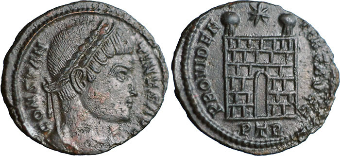 CONSTANTINE I. 307-337 AD. Æ 3 (19mm). CONSTAN-TINVS AVG, laureate head right. ® PROVIDEN-TIAE AVGG, campgate, two turrets, six layers, star above, no door. Mintmark PTR (Trier). RIC VII, 449. |