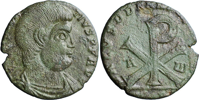 MAGNENTIUS. 350-353 AD. Æ (23mm). SALVS DD NN AVG ET CAES, large Christogram. A/W in field, mintmark AMB (Amiens). |