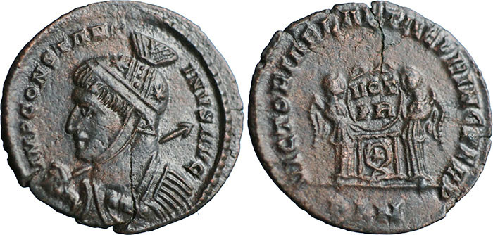 CONSTANTINE I. 307-337 AD. Æ 3 (18mm). IMP CONSTANT-INVS AVG, helmeted, cuirassed bust left, holding spear over right shoulder. ® VICTORIAE LAETAE PRINC PERP, two victories standing holding shield inscribed VOT/PR over altar. Mintmark PLN (London). RIC VII, 168. Rated r1. |