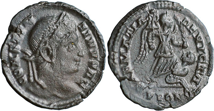 CONSTANTINE I. 307-337 AD. Æ 3 (19mm). CONSTAN-TINVS AG, laureate head right. ® SARMATIA-DEVICTA, Victory advancing right holding trophy and palm, captive at feet. Mintmark PLON crescent (London). RIC VII, 290. Rated R2. |
