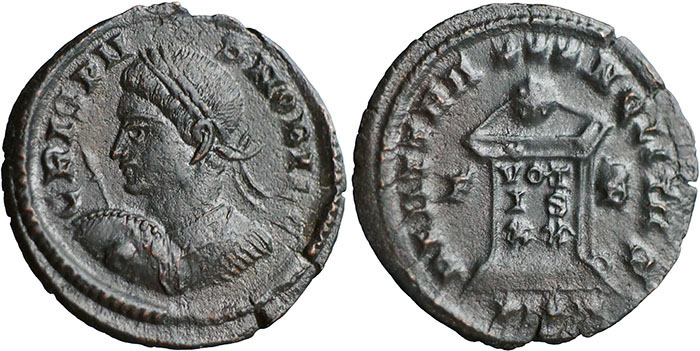 CRISPUS. 317-326 AD. Æ 3 (19mm). CRISPV-S NOBIL C, laureate bust left holding shield and forward pointing spear. ® BEAT TRA-NQLITAS altar inscribed VOT/IS/XX. F/B in field, mintmark PLON (London). RIC VII, 250. |