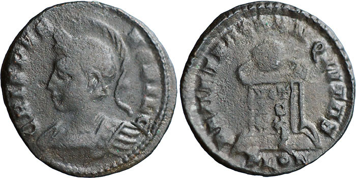 CRISPUS. 317-326 AD. Æ 3 (19mm). CRISPVS-NOBIL C, helmeted, draped, cuirassed bust left. ® BEAT TRA-NQLITAS altar inscribed VOT/IS/XX. Mintmark PLON (London). RIC VII, 274. Rated R4. |