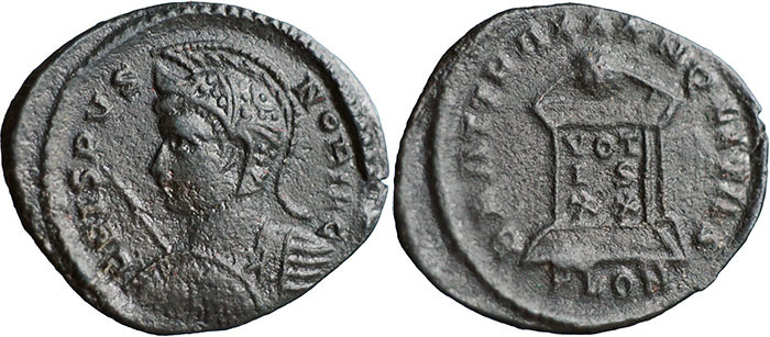 CRISPUS. 317-326 AD. Æ 3 (19mm). CRISPV-S NOBIL C, helmeted, cuirassed bust left holding shield and forward pointing spear. ® BEAT TRA-NQLITAS altar inscribed VOT/IS/XX. Mintmark PLON (London). RIC VII, 281. |